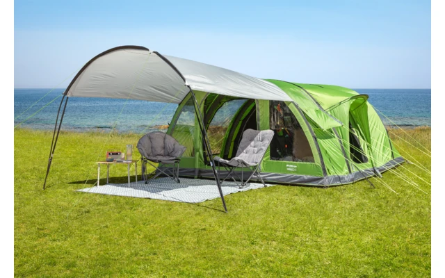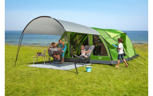 Large universal awning that creates a shaded area both in front of the caravan, bus or tent. The sturdy steel arched pole is adjustable in height from 180 – 230 cm. Suitable for vehicles with an attachment height of 180 – 225 cm and a straight rail length of 285 cm. With double piping.