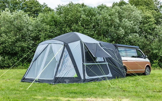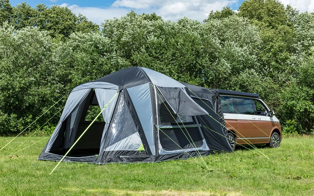 You are travelling with your bus and are looking for an awning that gives you maximum flexibility at your holiday destination? Then the Liberta-L Rear is the right choice for vehicles with a height of 180-205 cm! The rear tent Liberta-L Rear is an inflatable, free-standing awning with crossed poles. Thanks to the air poles, the rear tent can be erected quickly and easily. To attach it to the vehicle, simply pull the connecting sluice over the rear of the vehicle and fasten it with the tensioning strap. This enables universal use on different bus models (please note the mounting height).