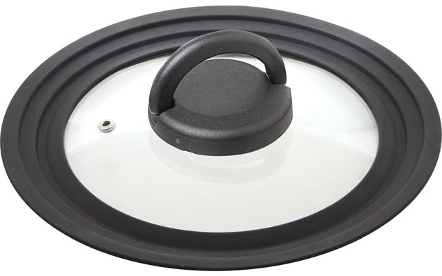 Universal glass lid with graduated silicone rim suitable for pots and pans with different diameters.