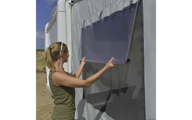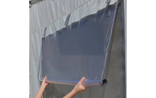The waterproof and windproof awning. Easy and quick to assemble (only 15 – 20 minutes one person). The front wall is simply pushed into the keder rail of the front bar.