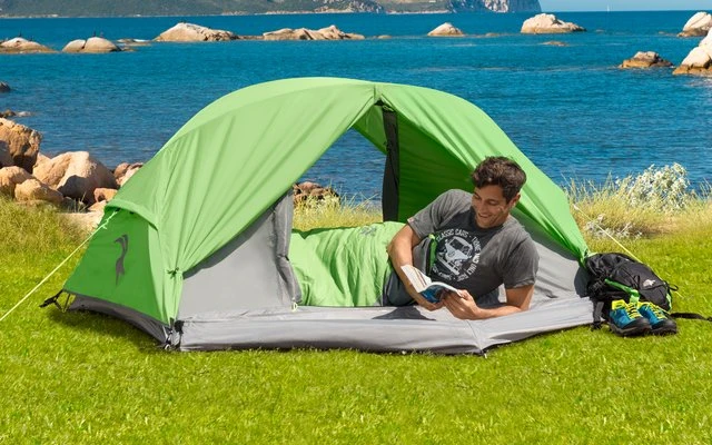 Provides sufficient space for 2 people, even on more demanding trips. The pack size makes it ideal for hiking trips, bicycle or motorbike tours. The geodesic design offers enormous wind stability. Two apses with attachable groundsheet (incl.) offer space for walking shoes and rucksack. Thanks to its construction, the tent can also be erected without a flysheet. Organiser in the inner tent provides a place for tent lamp, smartphone etc! Follow YOUR way…