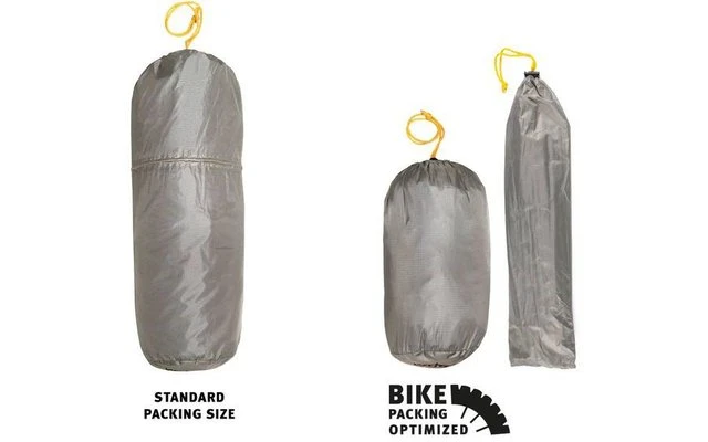 Pack size is handy and optimized for bike packing. With a pack size length of 45 cm, the tent fits well in a handlebar roll. The rainproof pack sack can be attached to the handlebars with Velcro straps or straps, even without a handlebar roll. The pack sack is also variable in length. By detaching the linkage, the pannier length is reduced to 30 cm. The linkage can be stowed where it may fit better, for example, in a frame bag.