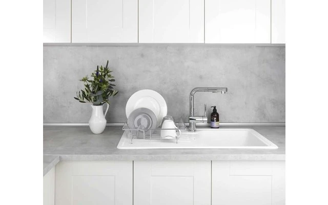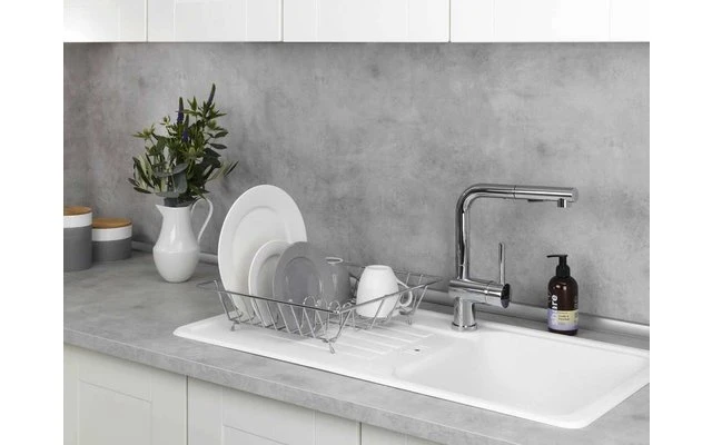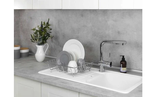 The dish drainer basket made of chrome-plated metal expands the sink shelf simply and in a space-saving way with storage space for plates, cups and glasses. The washed dishes get an optimal place for quick drying. As a functional accessory, it not only enriches the sink in the kitchen but can also be used in the kitchen area of the summer house or camper.