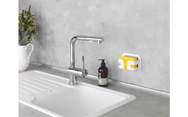 The decorative holder made of white plastic can be placed anywhere and the sponge is thus always within reach